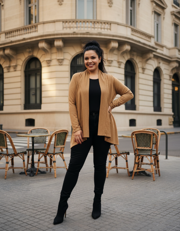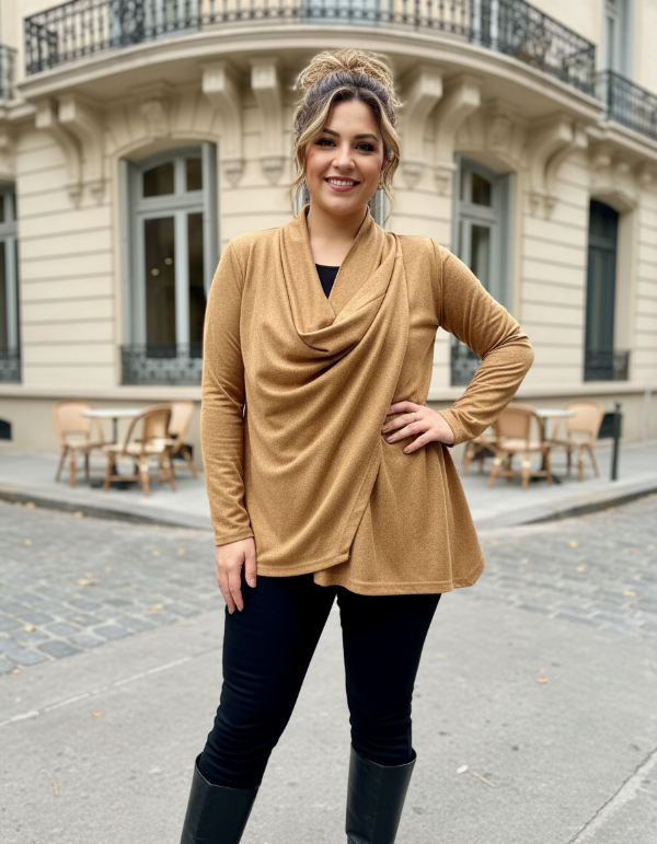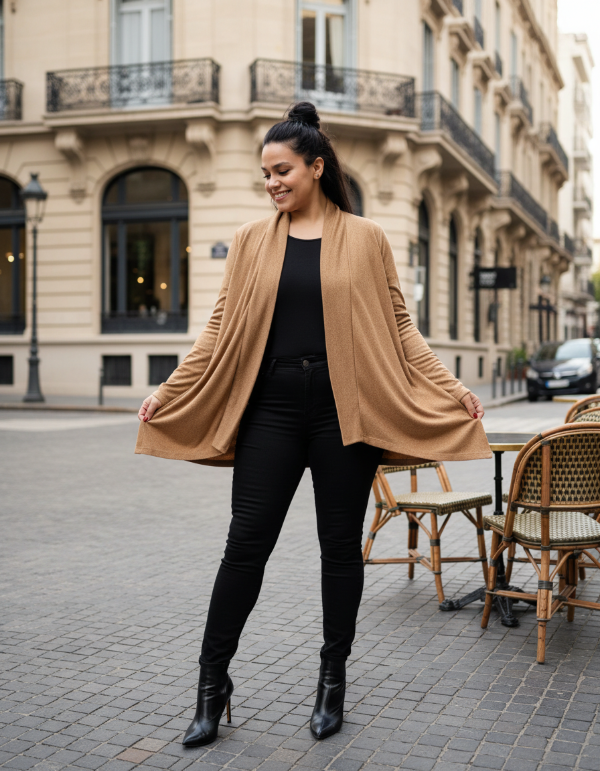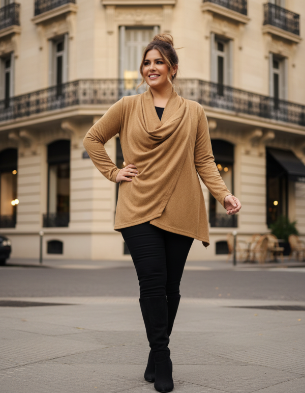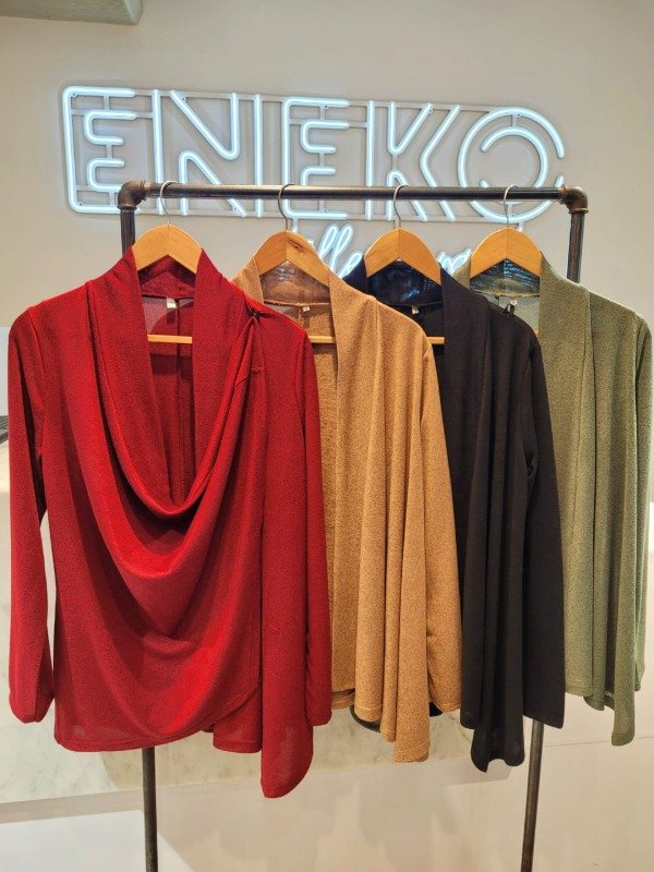 Saco amplio en lanilla fina jaspeada que al cerrarse toma forma de buche