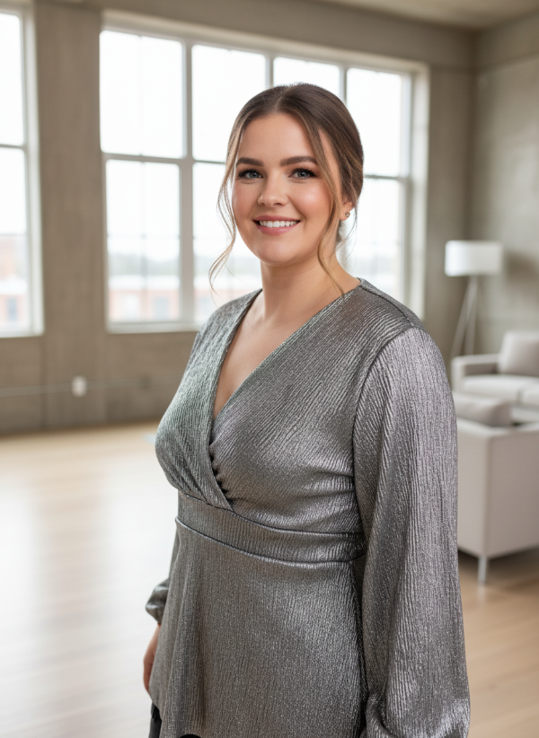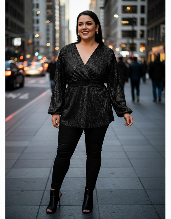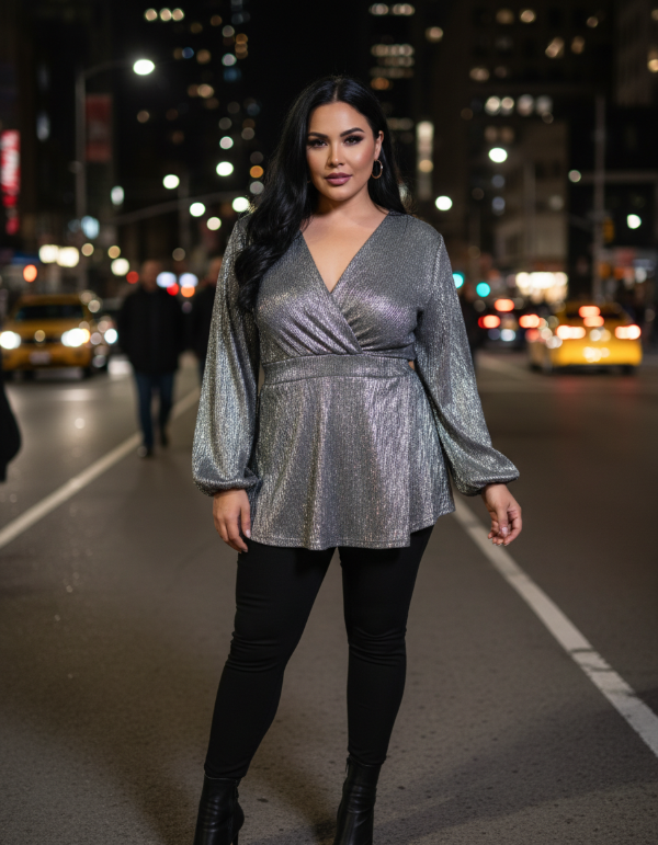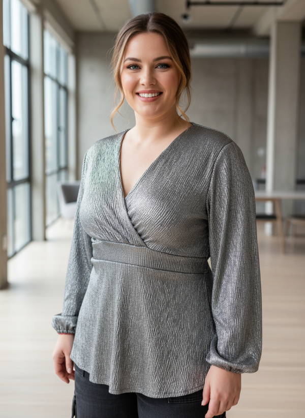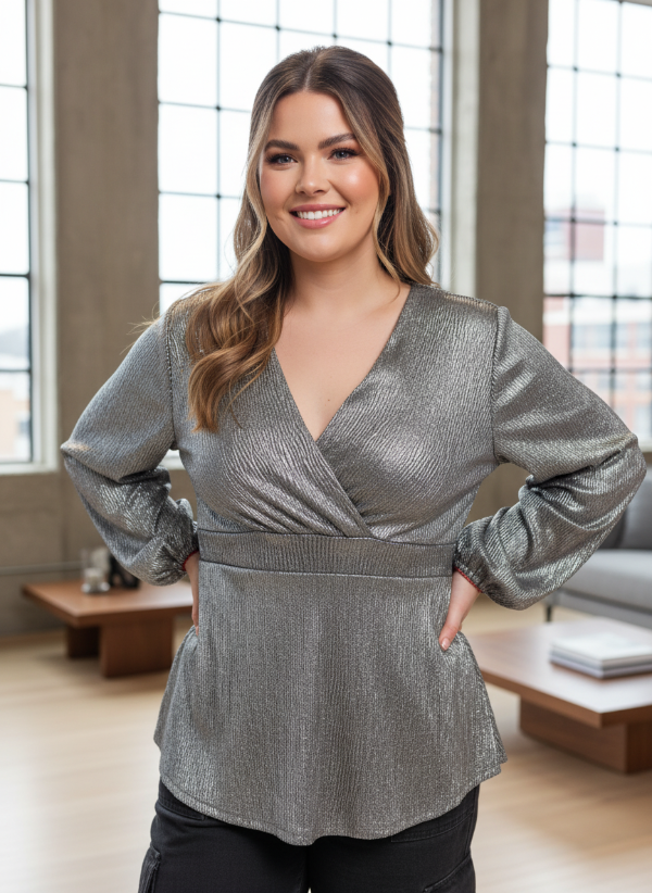 REMERA ESCOTE CRUZADO CON RECORTE EN EL BAJO BUSTO Y ELASTICO EN LA ESPALDA PARA ENTALLAR LA PRENDA. DETALLE DE MANGAS LARGAS ABULLONADAS. GENERO EN CASHMERE FOIL