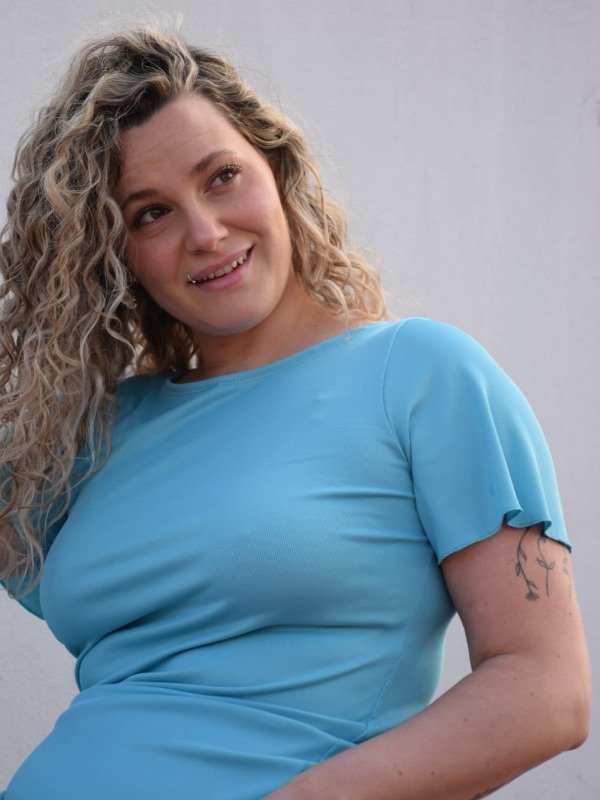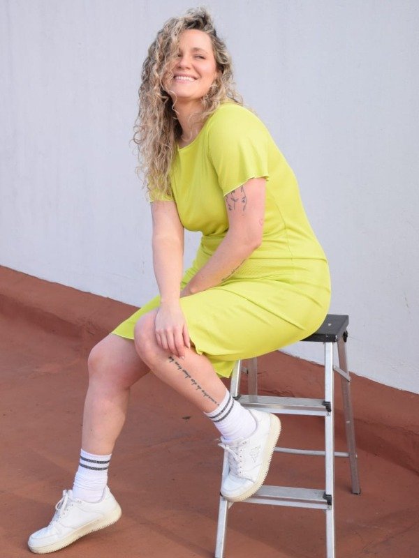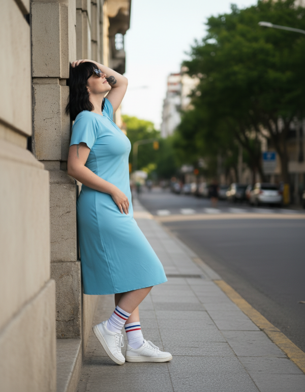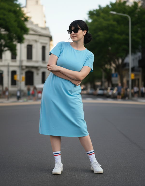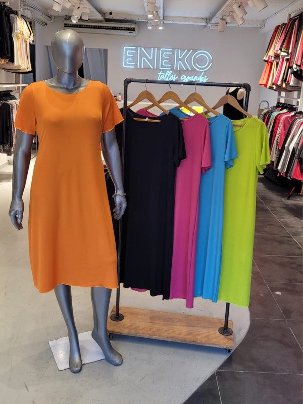 VESTIDO BASICO MANGA CORTA EN RIBB BRILLOSO, AL CUERPO Y LARGO POR DEBAJO DE LA RODILLA