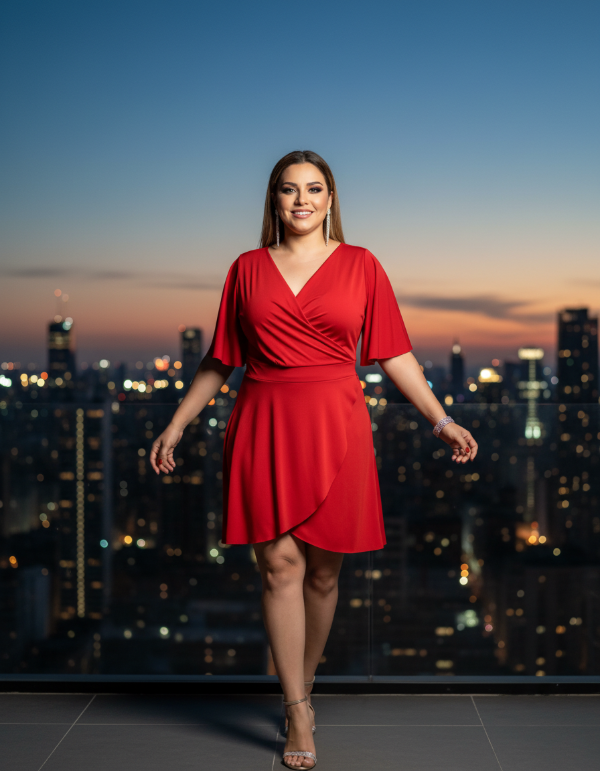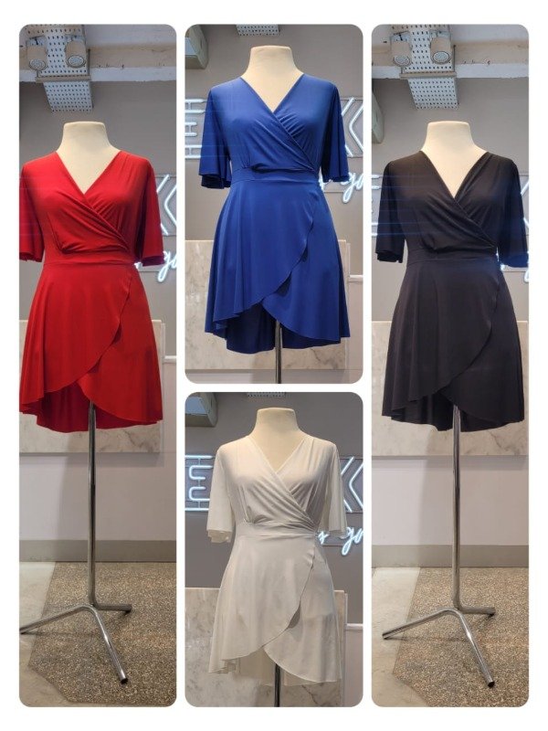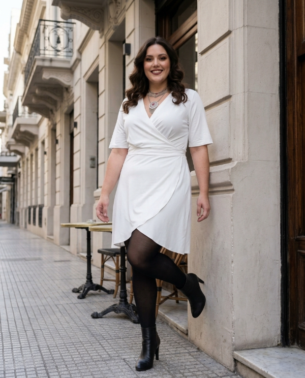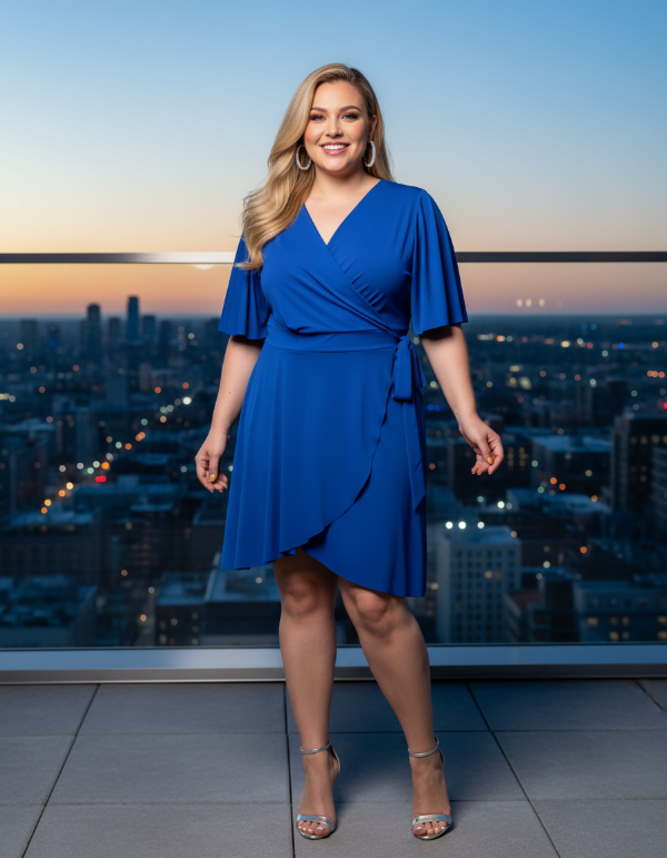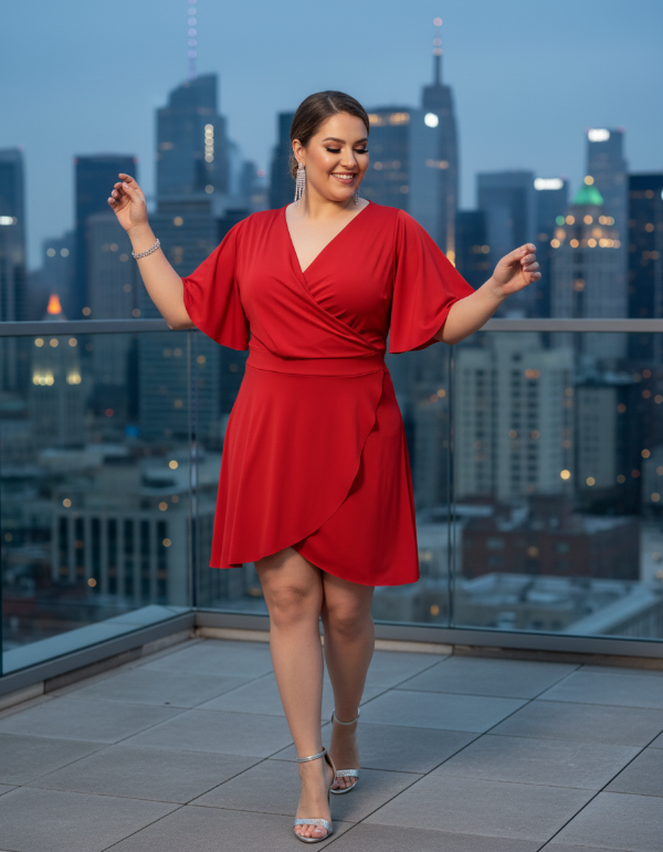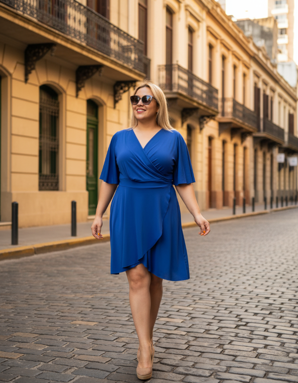 Vestido cruzado en ITY con mangas amplias y cinto regulable, largo por las rodillas.