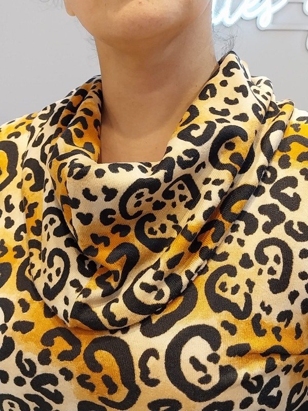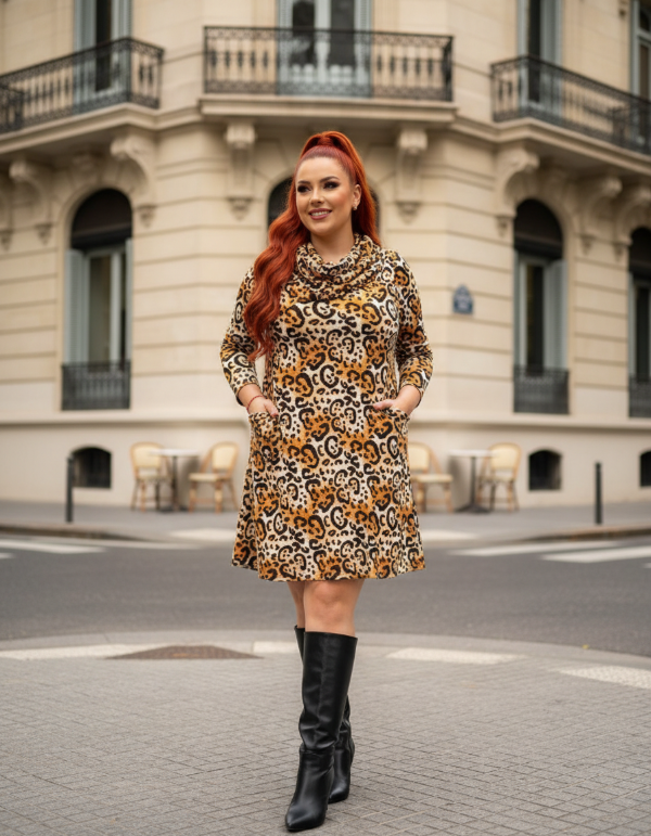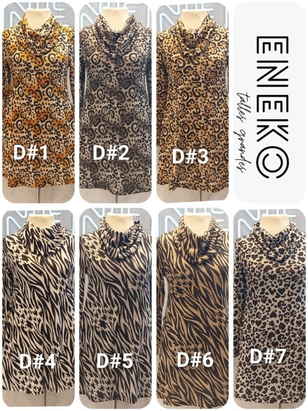 Vestido con cuello tipo poleron con bolsillos evasee en manga larga. Genero: Lanilla viscosa estampada