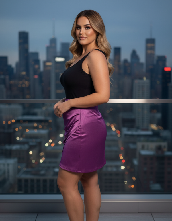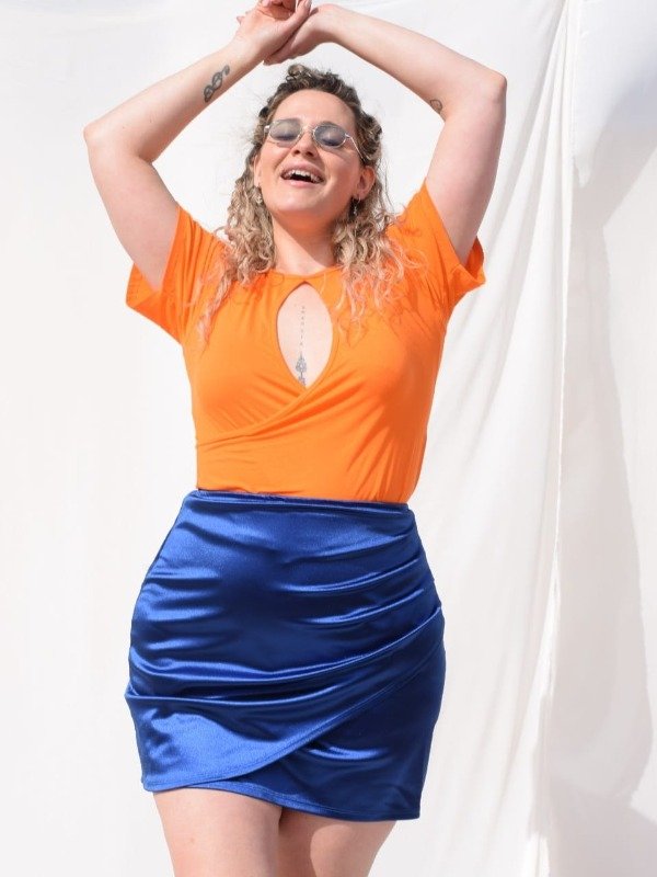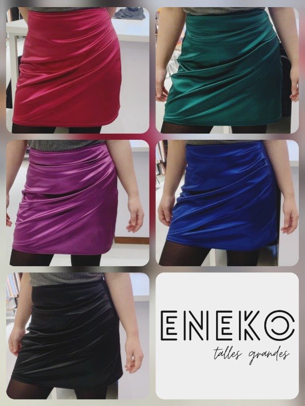 Falda mini drapeada en el lateral. En saten de punto metalizado.