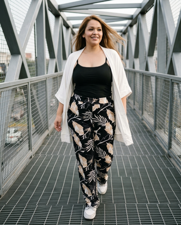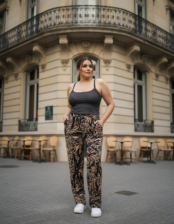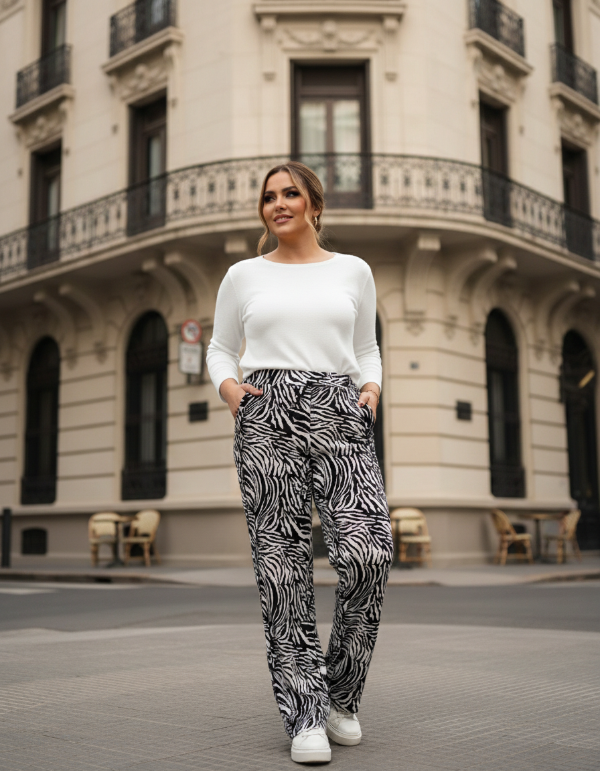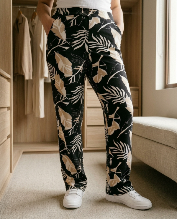 PANTALON EN LANILLA CASHMERE ESTAMPADO CON BOLSILLOS Y ELASTICO EN LA CINTURA.