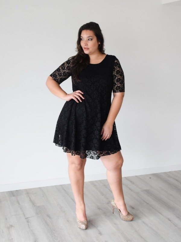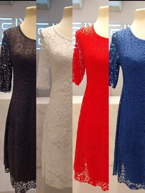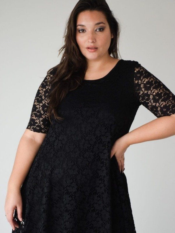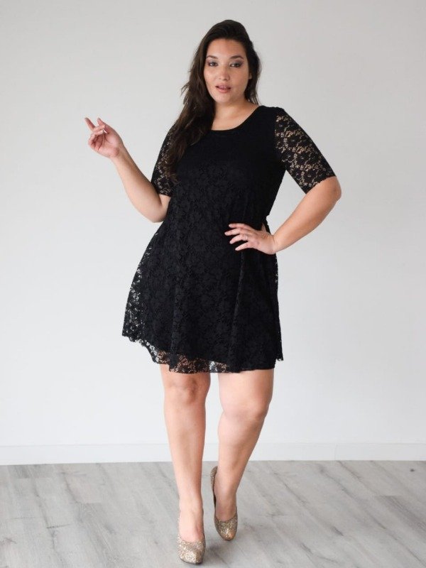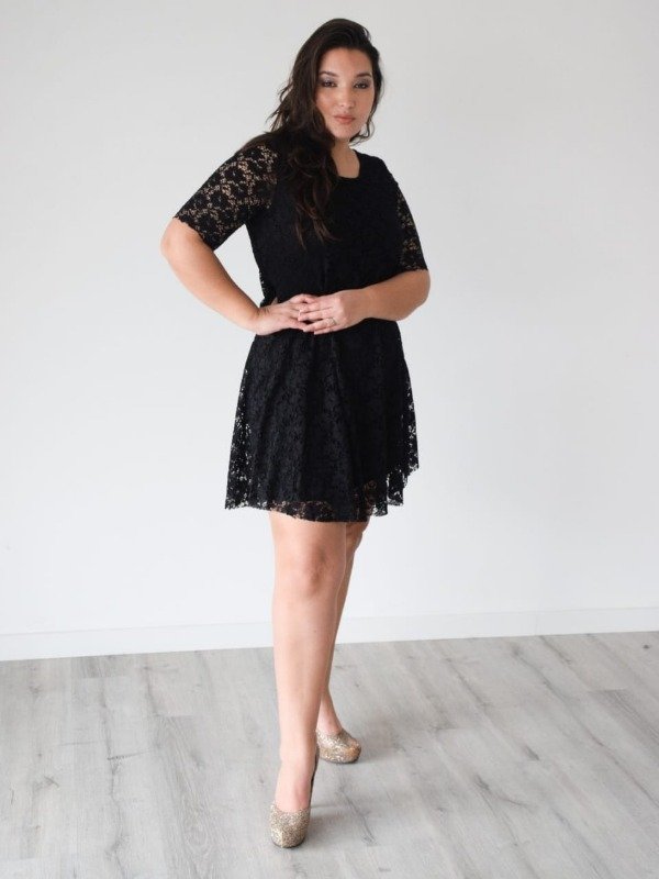 Vestido evasee superpuesto de encaje con mangas. El forro es de modal viscosa y es entallado al cuerpo.